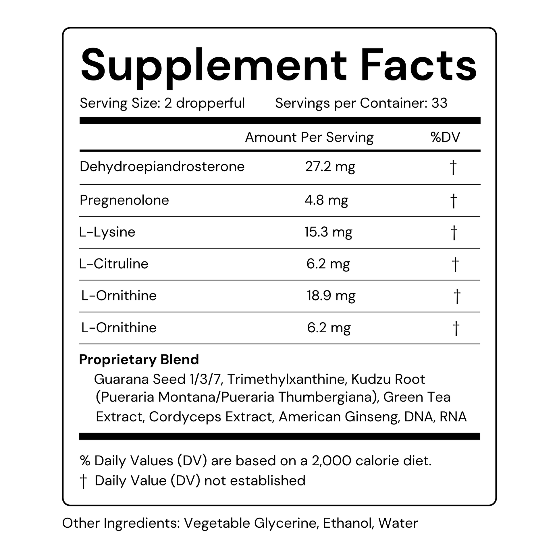 Proprietary Blend: Guarana Seed, 1,3,7-Trimethylxanthine, Kudzu Root (Pueraria montana / Pueraria thunbergiana), Green Tea Extract, Cordyceps Extract, American Ginseng, DNA, RNA